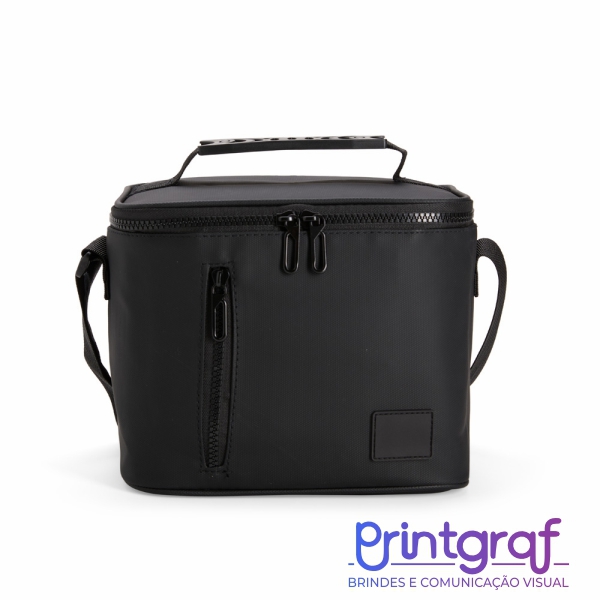 Bolsa térmica confeccionada em poliéster mesclado com PVC impermeável, fechamento por zíper e capacidade máxima de 6 litros.