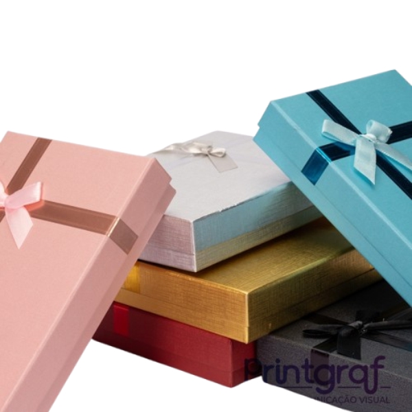 Caixa para presente em papelão com acabamento levemente texturizado e laço decorativo de cetim colado na tampa.