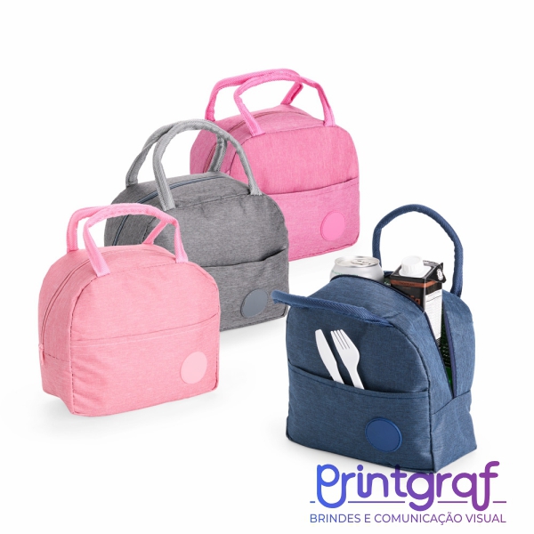 Bolsa térmica o confeccionada em poliéster impermeável e capacidade de até 5 litros.