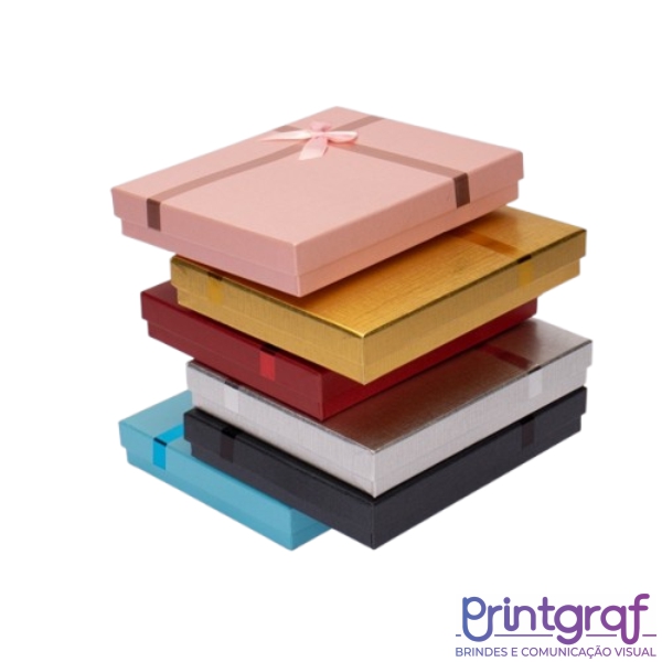 Caixa para presente feita em papelão com acabamento levemente texturizado e laço decorativo colado diretamente na tampa.