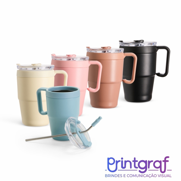 Caneca térmica em inox com pintura eletrostática e capacidade de até 600ml.