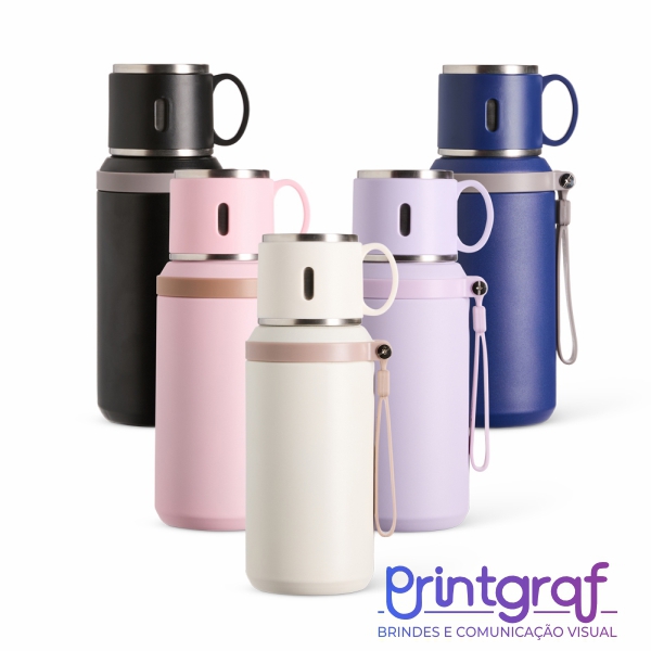 Garrafa térmica em inox com pintura eletrostática e capacidade de até 600ml.