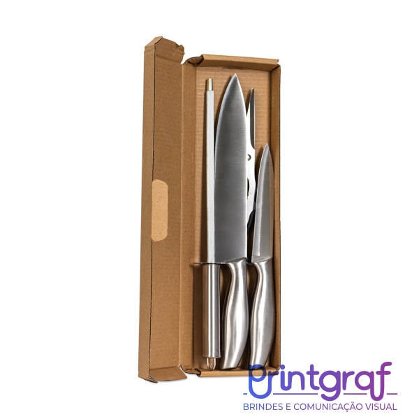 Kit churrasco formado por quatro itens em inox: uma faca de 8 polegadas, uma faca de 5 polegadas.